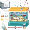 Wamachua Toys Aquarium Fish Tank Play Set is a colorful, realistic toy fish tank with underwater backgrounds, gravel decorations, and magnetic fishing accessories. Includes a fishing rod, net, fish, and feed bottle, plus lights and 12 music tunes. Ideal for children 3+ to boost hand-eye coordination, attention, and imaginative play.