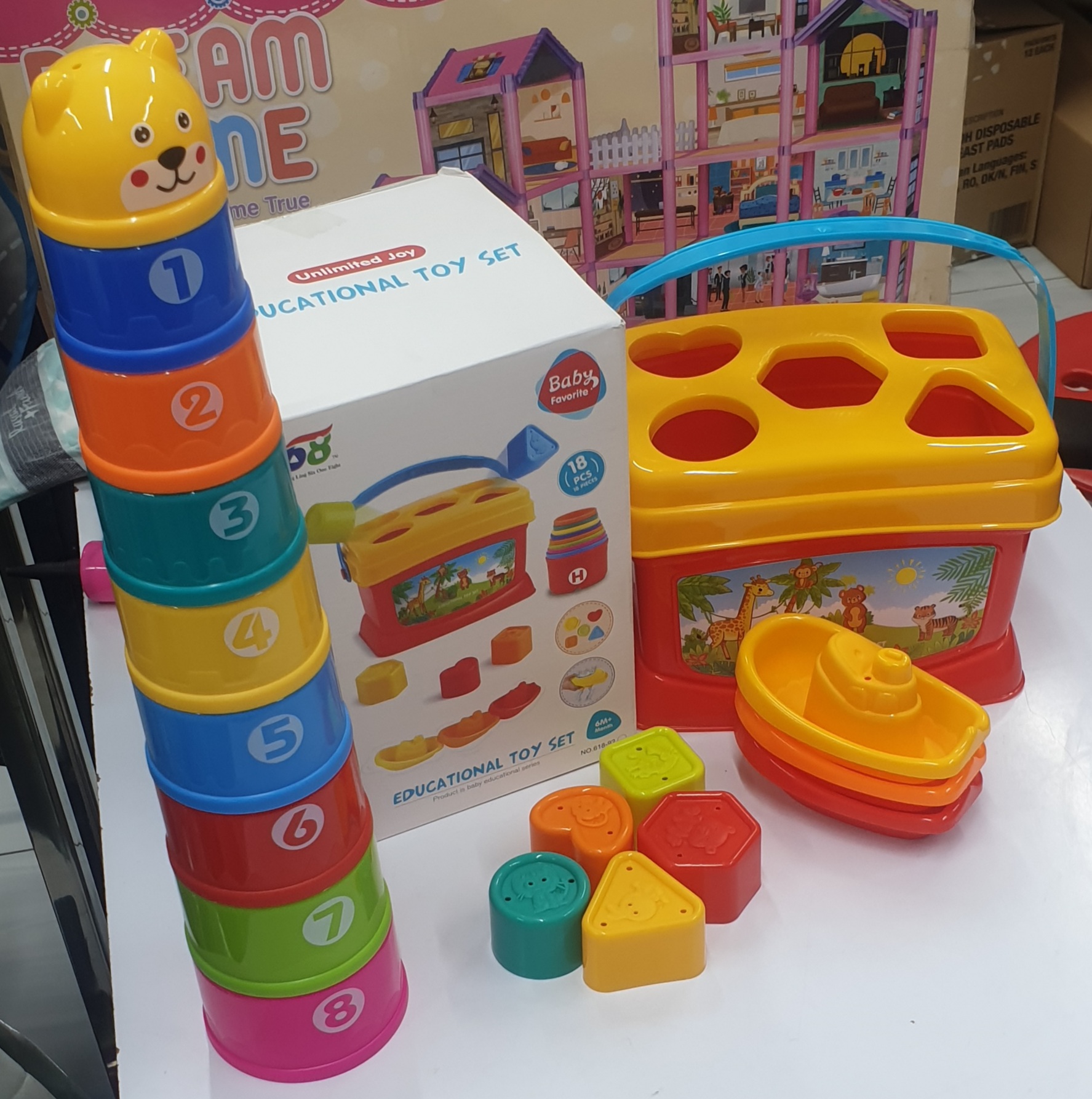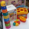 Educational bath toy set with a bucket sorter, stacking cups, and 3 boats for sensory play. Helps develop motor skills, color recognition, and early learning.