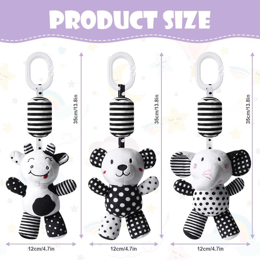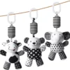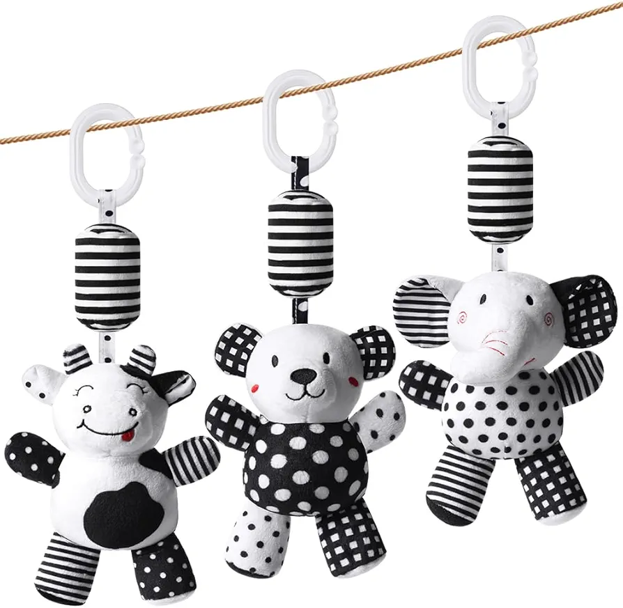 Hanging Rattle Toys (White & Black) by Wamachua Toys are soft plush sensory toys for newborns. Designed for cribs, strollers, car seats, and beds to encourage visual and motor development.