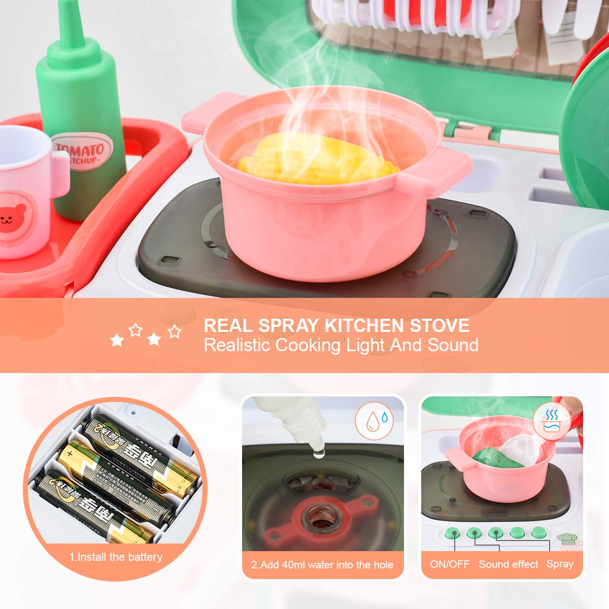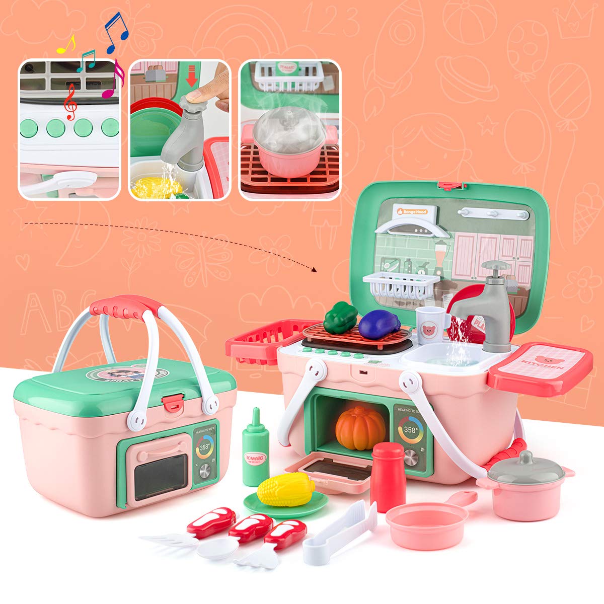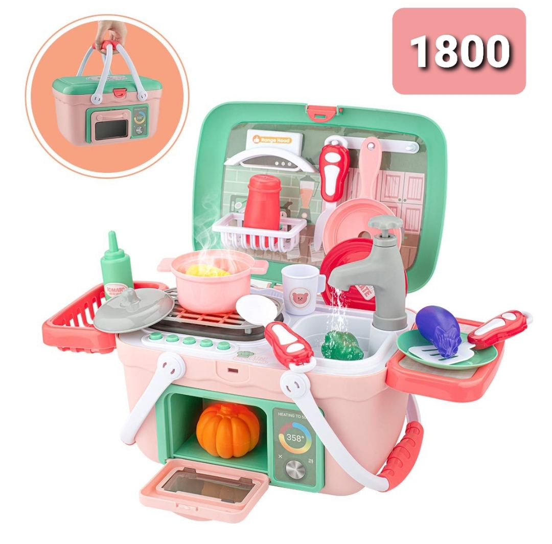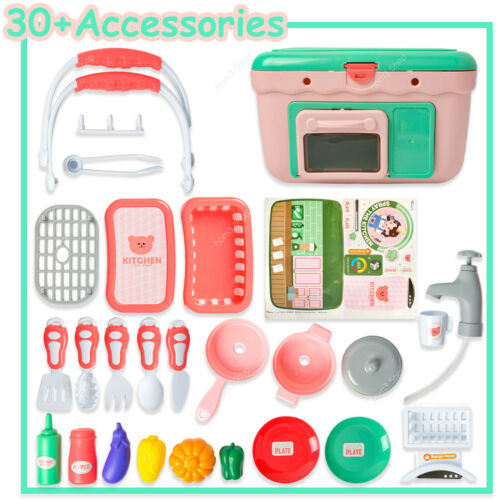 Kids Cooking Pretend Play Kitchen Set by Wamachua Toys is a compact 30-piece play kitchen with lights, boiling sounds, water tap, and accessories for fun pretend cooking.