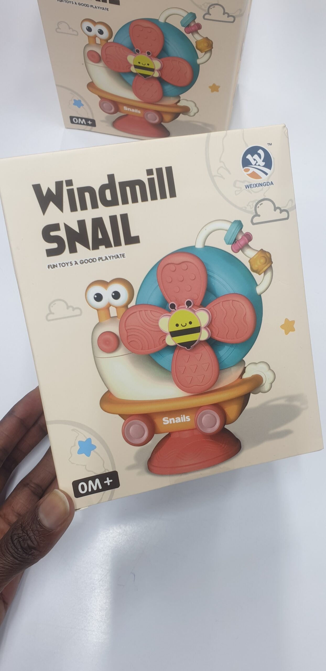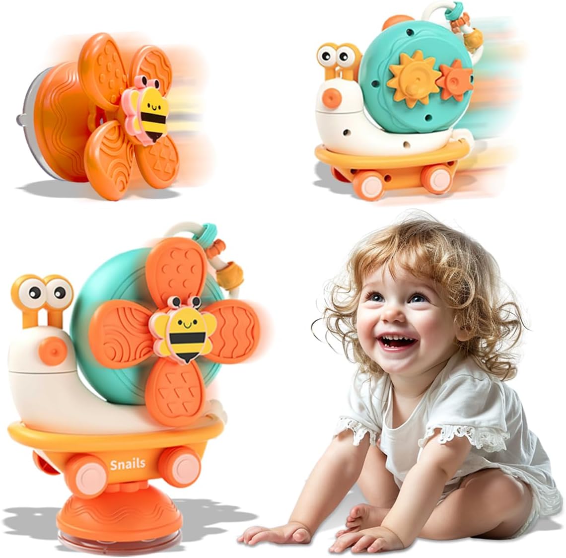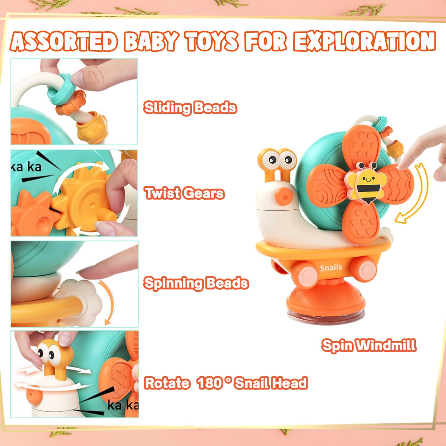 Suction cup spinner toy for toddlers and babies. This windmill snail sensory toy sticks to smooth surfaces like windows, bathtubs, and strollers. It spins with sound, improving fine motor skills and keeping kids entertained during travel or playtime.
