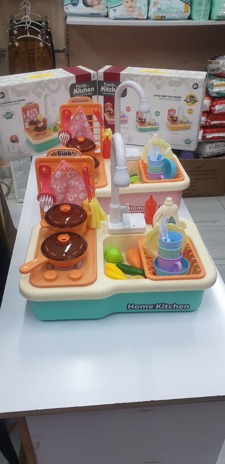 Play Sink with Running water + Kitchen set cooking table top with steam