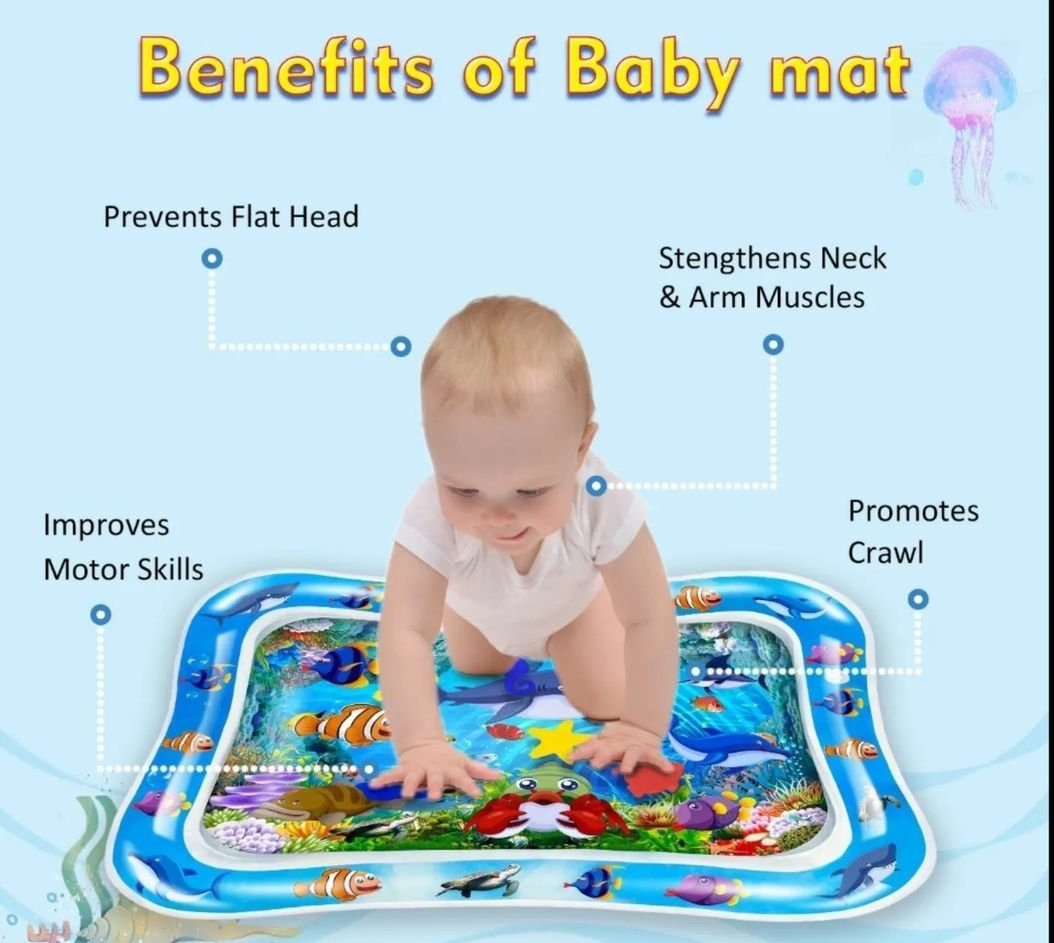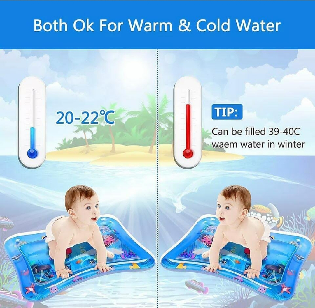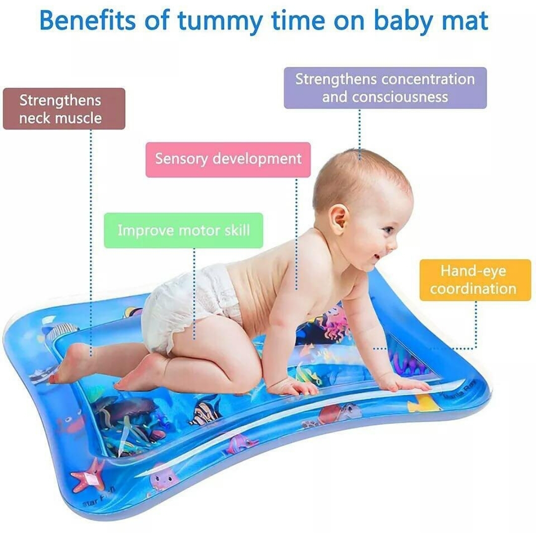 Inflatable tummy time water mat for babies 3–12 months. Encourages sensory play, strengthens neck and core muscles, and supports early development.
